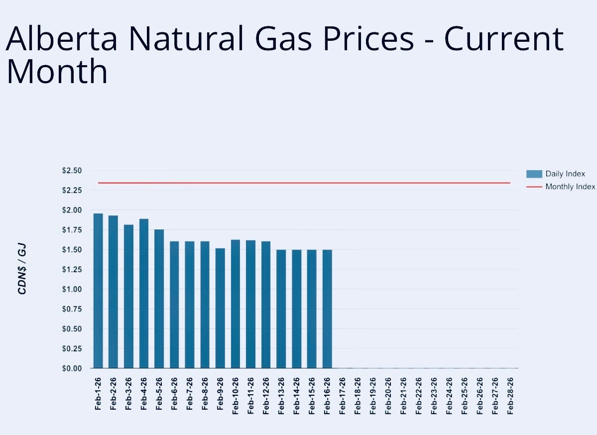 During the month of February, the AECO storage hub price in southeastern Alberta (Suffield) has weakened 50 cent from $2 per gigajoule (Feb 1st) to $1.50 per gigajoule (Feb 16th). Warm, above seasonal temperatures 1st half Feb temperatures have cut demand contributing price weakness.